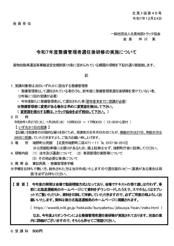 【北見地区】令和7年度整備管理者選任後研修のお知らせ