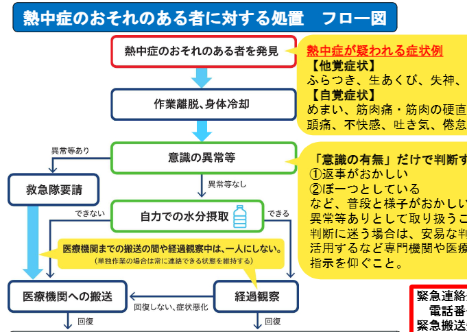 釧路労働基準監督署より「熱中症のおそれのある者に対する処置フロー図」のご提供がありました。適宜ダウンロード… -