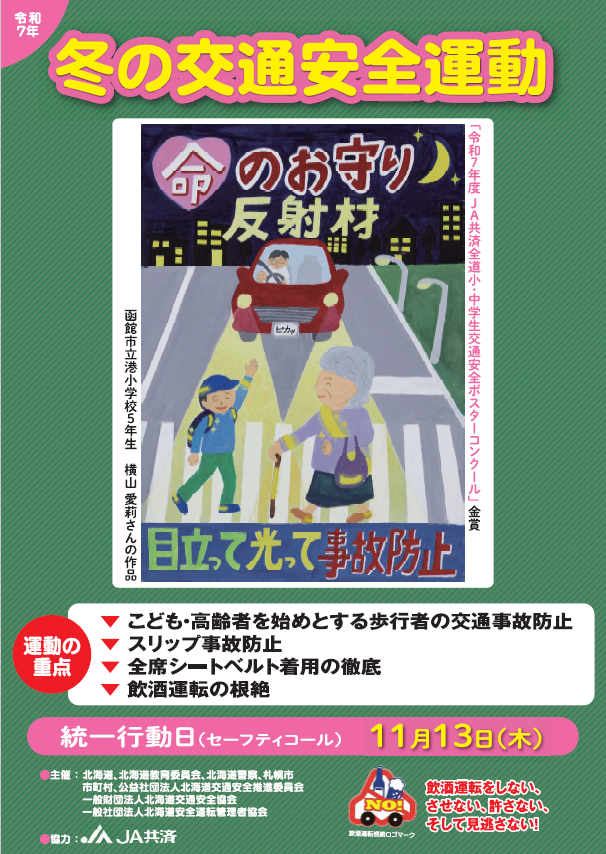 北海道トラック協会は、「令和7年冬の交通安全運動北海道実施要綱」に基づき作成した、北海道トラック協会実施要領において取組重点を示し、各地区トラック協会と連携して、11月13日(木)から11月22日(土)までの期間中における本運動を効果的に実施する。